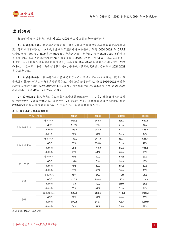 本报告对山外山2023年年报及2024年一季报进行了深入分析。公司在2023年实现了显著的业绩增长,主要得益于血液净化设备市场占有率的提升和海外市场的快速拓展。公司持续加大研发投入,优化费用结构,毛利率显著提升。尽管2024年一季度业绩有所下滑,但考虑到公司在设备和耗材业务方面的增长潜力,以及国内外市场的持续拓展,预计未来几年公司利润将保持增长。建议投资者保持关注。