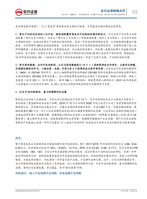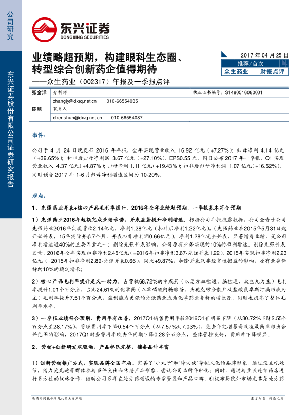 众生药业2016年业绩表现强劲,归母净利润同比增长39.65%,主要得益于先强药业的成功并表和核心产品毛利率的提升。2017年一季度业绩符合预期,费用管控效果显著,显示出公司良好的经营效率。公司通过营销创新和持续加大研发投入,不断完善产品梯队,并与药明康德合作开发1.1类新药,加速向综合创新药企转型。在核心业务板块眼科领域,公司通过设立前景眼科投资管理公司,积极整合资源,致力于构建“医药+医疗+健康管理”的全方位眼科生态圈,展现出清晰的长期发展战略。综合来看,公司内生外延双轮驱动,未来发展潜力巨大,预计2017-2019年归母净利润将分别达到4.86亿元、5.54亿元和6.30亿元,对应增速分别为17.18%、14.02%和13.71%。首次覆盖,给予“强烈推荐”评级。