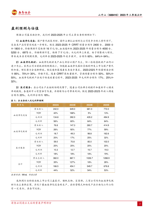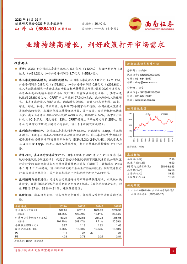 单三季度公司收入1.8亿元,同比增长71.1%;归母净利润0.5亿元,同比增长176.5%;扣非归母净利润0.5亿元,同比增长226.6%。收入增长主要得益于设备板块的持续快速增长,截至2023年8月末,山外山血透机和CRRT销售市占率均居行业第一,其中血透机占比23.5%,CRRT占比27.3%。海外市场收入上半年达6668万元,同比增长264%,已在70个国家打开销路。耗材业务也快速上量,上半年耗材收入突破4798万元,同比增长52%,其中自产耗材收入1019万元,同比增长133%,CRRT耗材上半年同比增长256%。