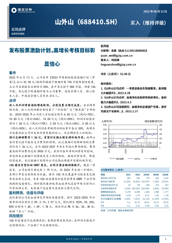 我们看好公司在血液净化市场的发展前景, 预计 2023-2025 年归母净利润分别为 2.09、 2.15、 2.57 亿元,同比增长 253%、 3%、 20%,EPS 分别为 1.45、 1.49、 1.78 元,现价对应 PE 为 36、 35、 30 倍,维持“买入”评级。