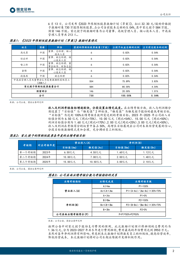 2023 年 6 月 13 日, 公司发布《 2023 年限制性股票激励计划(草案)》,拟以 32.30 元/股的价格授予激励对象 730 万股限制性股票,占公司当前股本总额的 5.04%,其中首次授予 584 万股,预留 146万股。首次授予的激励对象为公司董事、高级管理人员、 核心技术人员、 中高层管理人员等共 213 人。
