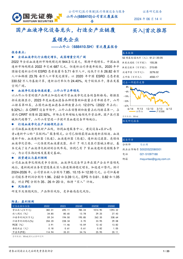 本报告对山外山公司进行了全面分析,认为公司在血液净化领域具备强劲竞争力,受益于行业增长和国产替代趋势,未来发展潜力巨大。公司应继续加强技术创新,优化产业链布局,积极应对市场竞争和政策变化,实现可持续增长。