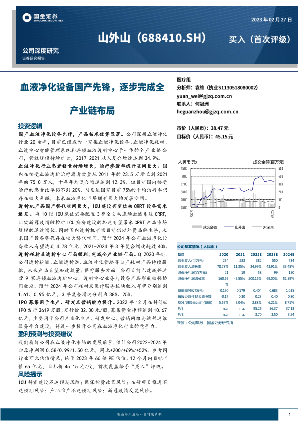 我们看好公司在血液净化市场的发展前景,预计公司2022-2024年归母净利润0.58/0.99/1.50亿元,同比+200/+69%/+52%。参考同行业可比估值情况,给予2023年66倍PE估值、12个月内目标市值65亿元,目标价45.15元/股,首次覆盖给予“买入”评级。