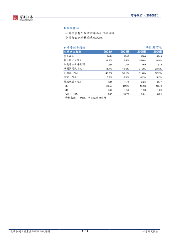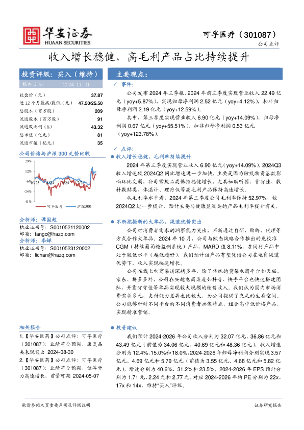 本报告对可孚医疗(301087)的2024年三季报进行了专业而深入的分析。报告指出,公司在2024年前三季度实现了稳健的收入增长,尤其在第三季度,营收和净利润增速显著加快,这主要得益于防疫物资基数影响的减弱以及助听器、背背佳等高毛利常规品类的强劲增长。公司毛利率持续提升,反映了产品结构的优化和盈利能力的增强。在市场拓展方面,可孚医疗通过不断挖掘大单品(如免校准CGM系统)并充分利用其在传统和兴趣电商平台的深厚渠道优势,实现了精准营销和销售规模的扩大。华安证券维持对可孚医疗的“买入”评级,并对其未来三年的收入和净利润增长持乐观预期,预计公司盈利能力将持续增强,估值吸引力逐步提升。同时,报告也审慎提示了销售效率和行业竞争加剧的潜在风险。