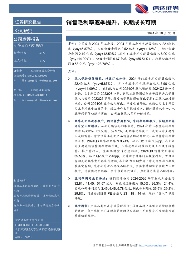 本报告分析了公司2024年三季报,指出公司营收保持稳健增长,毛利率逐季提升,但受销售费用影响,净利率环比承压。预计公司未来几年营收和净利润将保持快速增长,维持“买入”投资评级,并提示了相关风险因素。