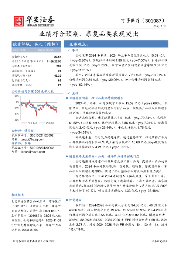 业绩符合预期,康复品类表现突出