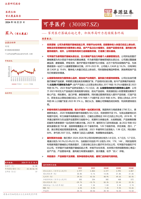 公司积极布局听力连锁服务终端,有望打造第二增长曲线。综合来看,可孚医疗未来发展潜力巨大,首次覆盖,给予“买入”评级。