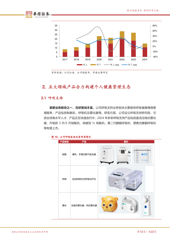 呼吸支持业务板块是公司重要组成部分,提供呼吸健康慢病管理服务,产品包括制氧机、呼吸机及雾化器等。公司设立呼吸支持研究院,引进高水平人才,产品快速迭代。目前该板块体量较小,但收入利润均有较大提升空间。