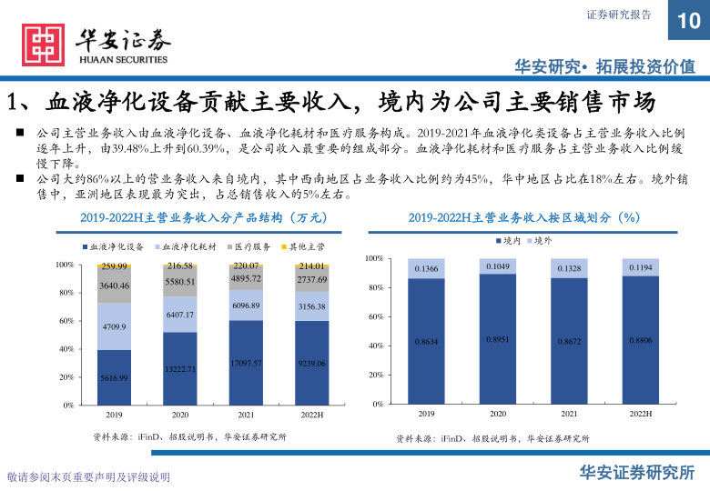 公司品牌优势助力终端覆盖,海内外市场并驾齐驱。公司设备在160多家大型三甲医院实现了终端装机,国内客户总量累计超过1000家,建立了较好的品牌形象和产品口碑。与此同时,山外山血液净化设备系列产品以其优异的产品性能和稳定安全的治疗模式,已远销印尼、菲律宾、泰国、印度、南非、利比亚、巴基斯坦、希腊、巴拉圭、瑞士、摩洛哥、尼日利亚、秘鲁、坦桑尼亚、苏丹、马来西亚等62个国家和地区,累计实现了1800余台的海外市场装机量。