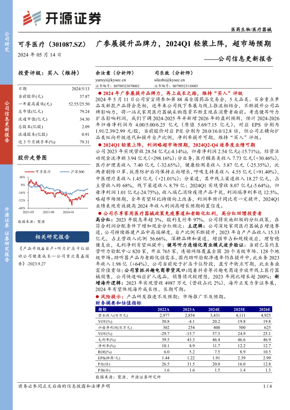 公司2023年实现营收28.54亿元(-4.14%),归母净利润2.54亿元(-15.71%),经营活动现金流净额3.94亿元(+298.16%);分业务,医疗辅具类收入7.73亿元(+30.46%),医疗护理类收入7.40亿元(-32.65%),健康检测类收入5.87亿元(-25.35%),此两者剔除口罩、抗原防护后均保持正向增长,呼吸支持类收入4.55亿元(+91.40%),中医理疗类收入1.45亿元(+21.01%);分渠道,其中线上渠道收入18.27亿元,占主营收入的68%,线下渠道收入8.79亿;2024Q1实现营收8.07亿元(-5.64%),归母净利润1.01亿元(-24.75%),收入端已消除疫情产品干扰,利润端净利率达12.5%,略超市场预期,全年有望环比持续向上改善,利润率预计同比有一定提升,2024Q1业绩表现有效提高2024年收入利润高增长预期的置信度。