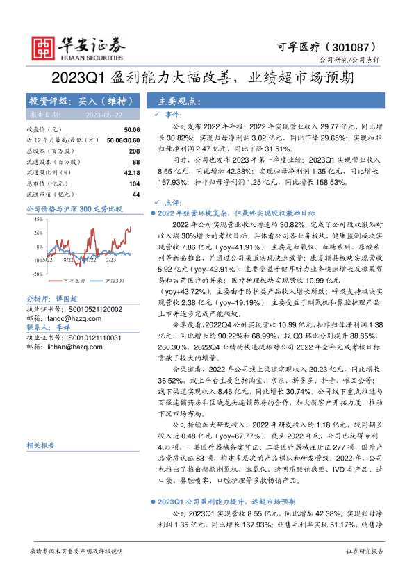 本报告对可孚医疗(301087)2022年年报和2023年第一季度业绩进行了分析,核心观点如下: