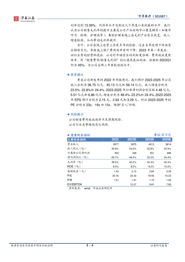 本报告分析了可孚医疗2022年年报和2023年第一季度业绩,指出公司在2022年实现了稳健的收入增长,并完成了股权激励目标。2023年第一季度,公司盈利能力大幅提升,业绩远超市场预期,主要得益于产品结构优化和线上运营效率提升。基于此,报告预测公司未来收入和利润将保持增长,并维持“买入”评级。同时,报告也提示了公司可能面临的销售费用投放效率不及预期和行业竞争格局恶化的风险。