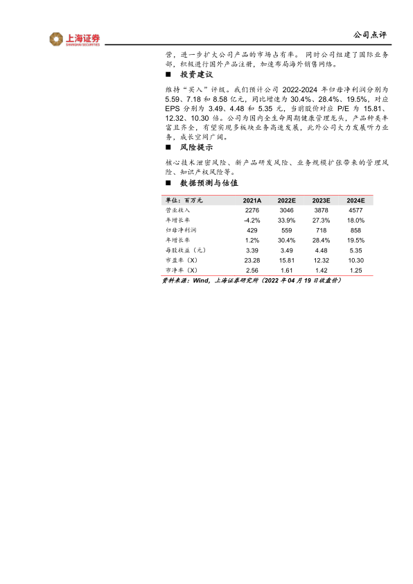 维持“买入”评级。我们预计公司2022-2024年归母净利润分别为5.59、7.18和8.58亿元,同比增速为30.4%、28.4%、19.5%,对应EPS分别为3.49、4.48和5.35元,当前股价对应P/E为15.81、12.32、10.30倍。公司为国内全生命周期健康管理龙头,产品种类丰富且齐全,有望实现多板块业务高速发展,此外公司大力发展听力业务,成长空间广阔。