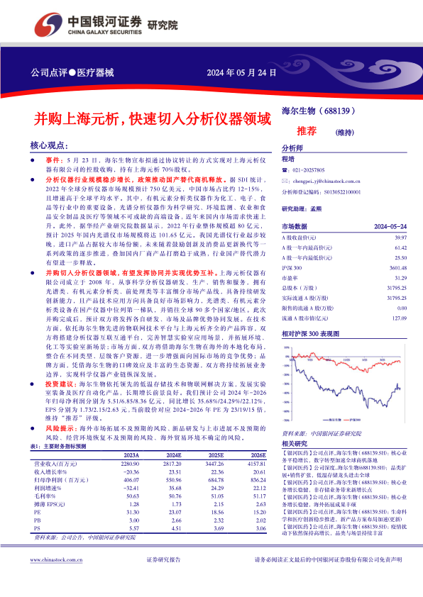 事件:5月23日,海尔生物宣布拟通过协议转让的方式实现对上海元析仪器有限公司的控股收购,持有上海元析70%股权。