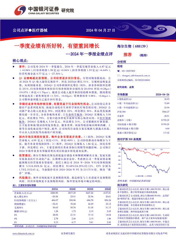 投资建议:海尔生物依托领先的低温存储技术和物联网解决方案,发展实验室装备及医疗自动化产品,长期增长前景良好。考虑到公司一季度业绩表现超预期且经营效果有望延续,我们上调公司2024年-2026年归母净利润预测至5.51/6.85/8.36亿元,同比增长35.68%/24.29%/22.12%,EPS分别为1.73/2.15/2.63元,当前股价对应2024-2026年PE为21/17/14倍,维持“推荐”评级。