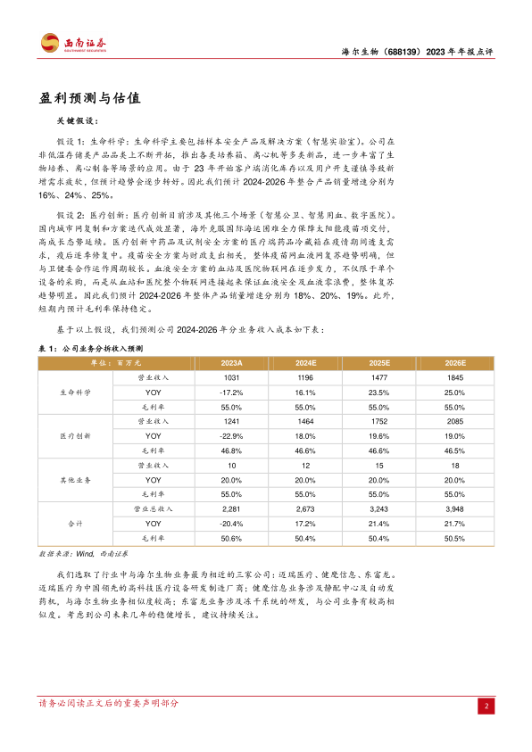 本报告对海尔生物2023年年报进行了深入分析,指出公司业绩受到多重因素影响而有所承压,但通过加大研发投入和拓展非存储类新业务,有望在未来实现稳健增长。同时,公司积极拓展海外市场,深化全球布局,为长期发展奠定基础。报告还对公司未来几年的盈利进行了预测,并提出了投资建议和风险提示,为投资者提供了有价值的参考信息。
