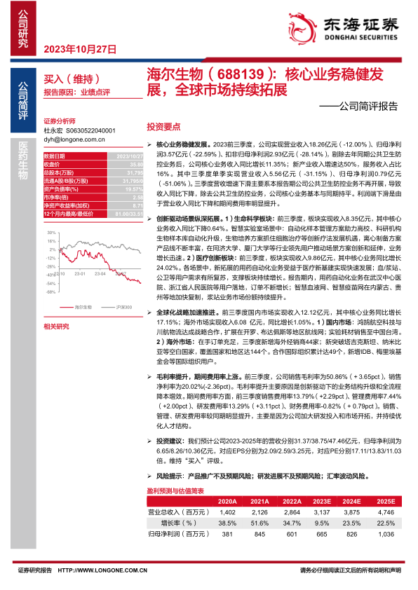 海尔生物(688139)在2023年前三季度剔除公共卫生防控业务后,核心业务收入同比增长11.35%,新产业收入增速达50%,服务收入占比16%。公司通过创新驱动和全球化战略,在生命科学和医疗创新领域实现场景纵深拓展,并在国内外市场取得进展。