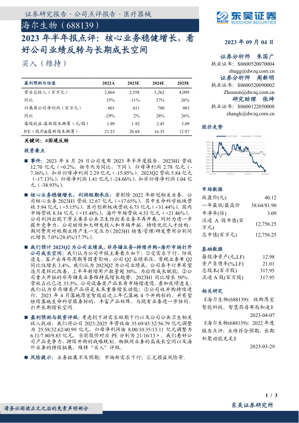 考虑到下游需求短期下行以及公共卫生相关收入扰动,东吴证券研究所对海尔生物2023-2025年的盈利预测进行了调整。预计2023-2025年营收分别为25.58亿元、32.62亿元和40.99亿元(原预测为35.69亿元、45.32亿元和56.79亿元);归母净利润分别为6.11亿元、7.80亿元和9.83亿元(原预测为8.00亿元、10.35亿元和13.11亿元)。当前股价对应2023-2025年PE分别为21倍、16倍和13倍。尽管预测下调,但报告看好公司产品竞争力、持续并购战略、物联网业务高成长空间以及海外业务拓展,维持“买入”评级。