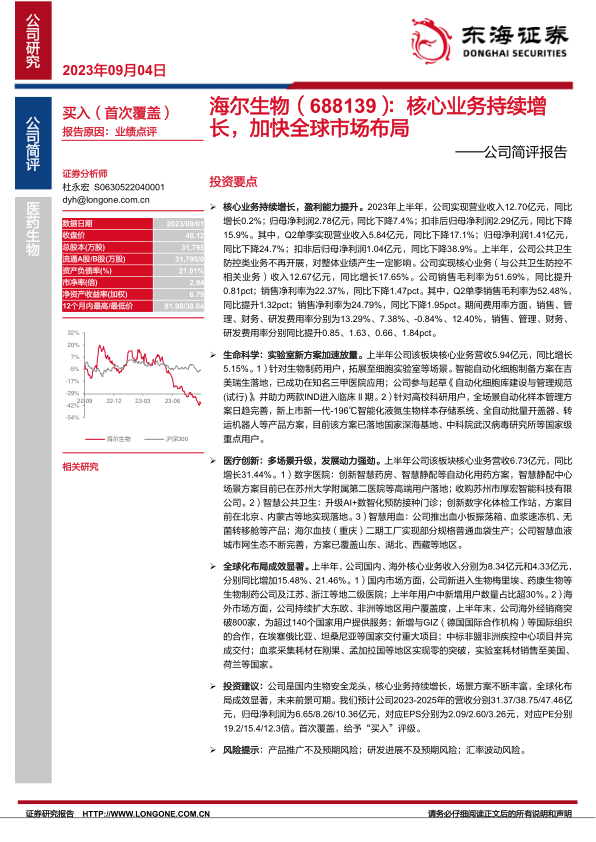 公司全球化布局成效显著,国内外市场均实现增长。通过不断丰富场景方案和拓展市场,海尔生物未来发展前景可期,首次覆盖给予“买入”评级。