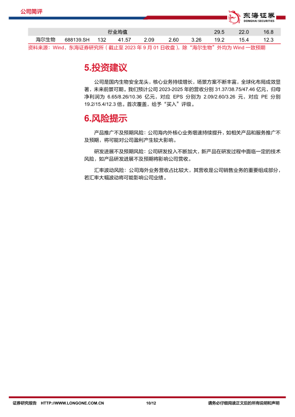 投资建议:公司是国内生物安全龙头,核心业务持续增长,场景方案不断丰富,全球化布局成效显著,未来前景可期。我们预计公司2023-2025年的营收分别31.37/38.75/47.46亿元,归母净利润为6.65/8.26/10.36亿元,对应EPS分别为2.09/2.60/3.26元,对应PE分别19.2/15.4/12.3倍。首次覆盖,给予“买入”评级。