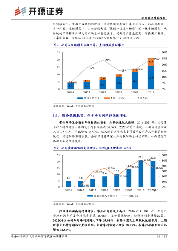 公司营收端保持高速增长,2016-2021年营业收入年均复合增长率高达34.56%,2022年前三季度实现营业收入20.75亿元,同比增长36.52%。归母净利润同样高速稳健增长,2016-2021年复合增长率达46.98%。尽管2022年前三季度归母净利润同比下降33.91%,但剔除股权激励费用和投资收益后,归母净利润同比增长28.63