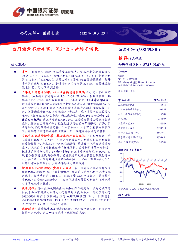 本报告对海尔生物(688139.SH)进行了深度分析,核心观点如下: