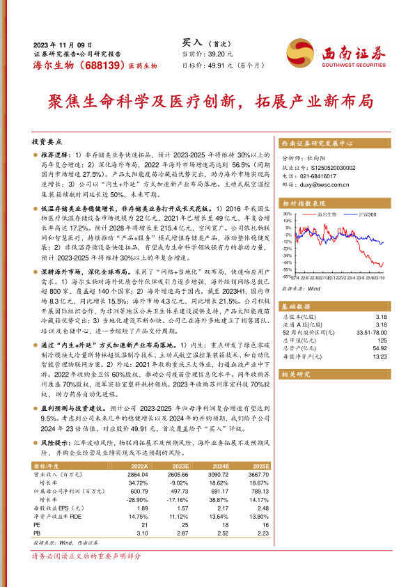 海尔生物凭借其在低温存储领域的领先地位,积极拓展非存储业务和海外市场,通过“内生+外延”的方式加速新产业布局。公司在生命科学和医疗创新领域具有广阔的发展前景,未来业绩有望保持稳健增长。