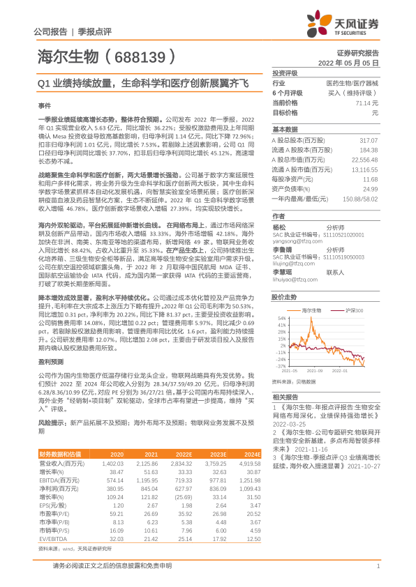 本报告分析了海尔生物(688139)2022年一季度业绩,并维持“买入”评级。报告核心观点如下: