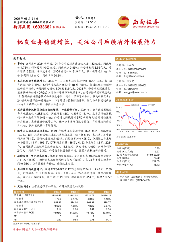 根据预测,公司2025-2027年对应的动态市盈率(PE)分别为8倍、7倍、7倍。与流通行业可比公司(九州通、百洋医药、上海医药)的平均2025年PE(11倍)相比,柳药集团的估值具有明显优势。考虑到公司2025年规划清晰且经营稳健性高,分析师给予公司2025年10倍PE,对应目标价22.40元,并维持“买入”评级。公司还计划每10股派发现金股利7.51元(含税),预计派发现金红利约3亿元(含税),占2024年年度归母净利润的35%,体现了公司对股东回报的重视。