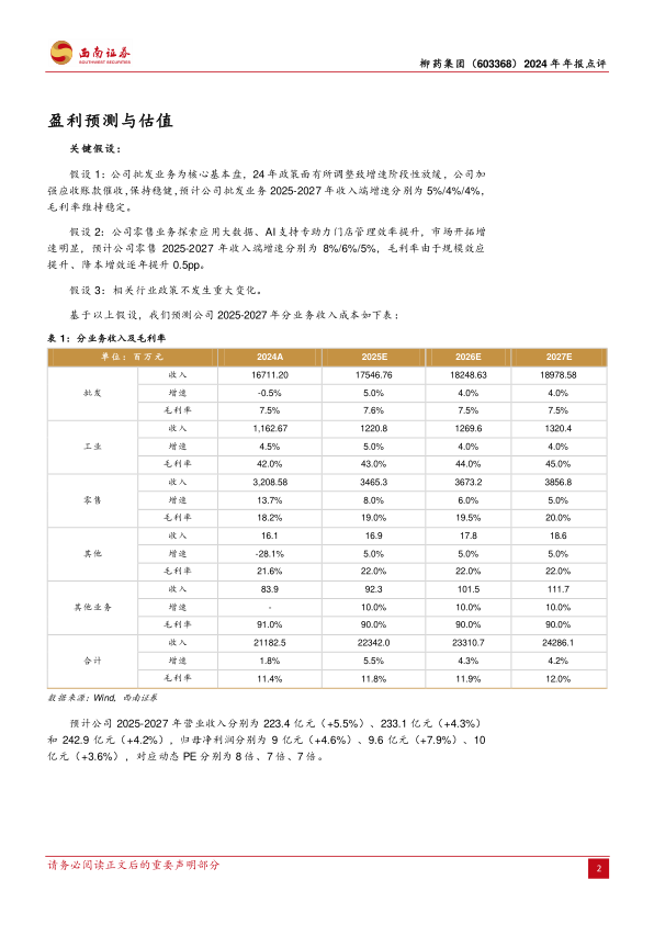 分析师对柳药集团2025-2027年的业绩进行了预测。预计公司营业收入将分别达到223.4亿元(同比增长5.5%)、233.1亿元(同比增长4.3%)和242.9亿元(同比增长4.2%)。归母净利润预计分别为9亿元(同比增长4.6%)、9.6亿元(同比增长7.9%)和10亿元(同比增长3.6%)。相应的每股收益(EPS)预计为2.24元、2.42元和2.50元。这些预测基于以下关键假设:批发业务收入增速分别为5%/4%/4%,毛利率维持稳定;零售业务收入增速分别为8%/6%/5%,毛利率因规模效应和降本增效逐年提升0.5个百分点;以及相关行业政策不发生重大变化。