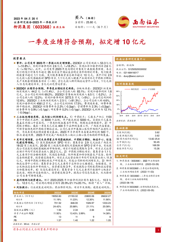 本报告分析了柳药集团(603368)2023年一季度业绩及定增预案,维持“买入”评级。