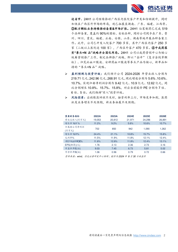 医药工业:产品&营销改革过渡期,全国化布局进行时。①24H1公司医药工业业务收入约5.62亿元(yoy+7.28%),医药工业业务归母净利润约0.98亿元(yoy+7.86%)。②饮片业务深耕广西市场并辐射周边省市。24H1公司继续推动广西区内医院客户开发和份额提升,同时加快在广西区外市场的布局,现已拓展至湖南、广东、福建、江西等。③配方颗粒业务持续推动备案&市场扩张。24H1仙茱制药已完成519个品种备案,覆盖约90%的国标、省标品种,同时公司同步在广东、贵州、四川、重庆、福建、云南、安徽、山东、湖南等地开展品种备案工作。此外,公司已开发入院客户700多家,其中广西区内客户250多家(二级以上医院近100家),广西区外客户470多家。④中成药落实“拳头+N品”战略并全国化布局。24H1公司以成药营销中心为核心统筹营销推广工作,制定品牌推广战略,即以“金冲”(复方金钱草颗粒)、归芪补血口服液、安神药血口服液等拳头产品为核心,新单品加持的“拳头+N品”战略。