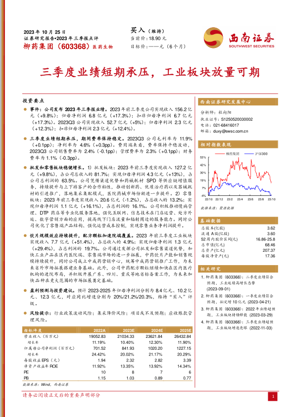 本报告分析了柳药集团(603368)2023年三季报业绩,指出公司三季度业绩短期承压,但批发和零售板块保持稳健增长,工业板块放量可期。维持“买入”评级,并预测公司未来三年归母净利润将保持稳定增长。