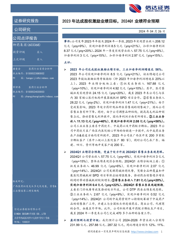 柳药集团在2023年成功达成股权激励业绩目标,归母净利润同比增长21%,显示出强劲的盈利能力。2024年第一季度业绩持续符合预期,其中零售业务受益于处方外流政策表现亮眼,工业业务也保持了良好的增长势头。公司通过优化业务结构,提升高毛利业务占比,有效驱动了整体业绩的增长。展望未来,随着零售和工业两大高毛利业务的持续放量,公司有望实现业绩与估值的双重提升。尽管面临应收账款回收、市场竞争等风险,但当前估值处于历史低位,维持“买入”评级。