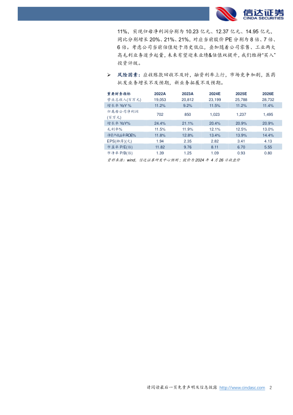 风险因素:应收账款回收不及时,融资利率上行,市场竞争加剧,医药批发业务增长不及预期,新业务拓展不及预期。