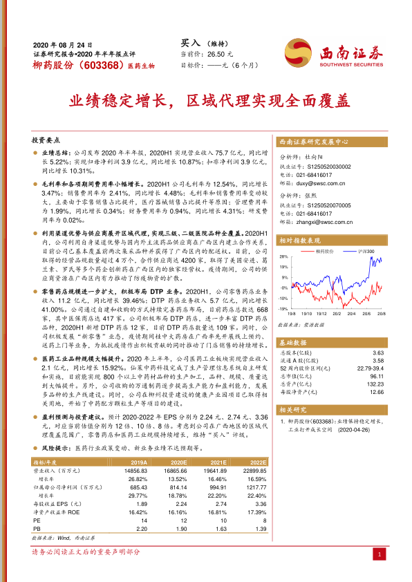 柳药股份2020年半年报显示,公司业绩保持稳定增长,区域代理优势显著,零售药店和DTP业务持续扩张,医药工业板块潜力逐步释放。公司通过多渠道发展和战略布局,不断提升盈利能力和市场竞争力。维持“买入”评级,但需关注医药行业政策变动和新业务发展风险。