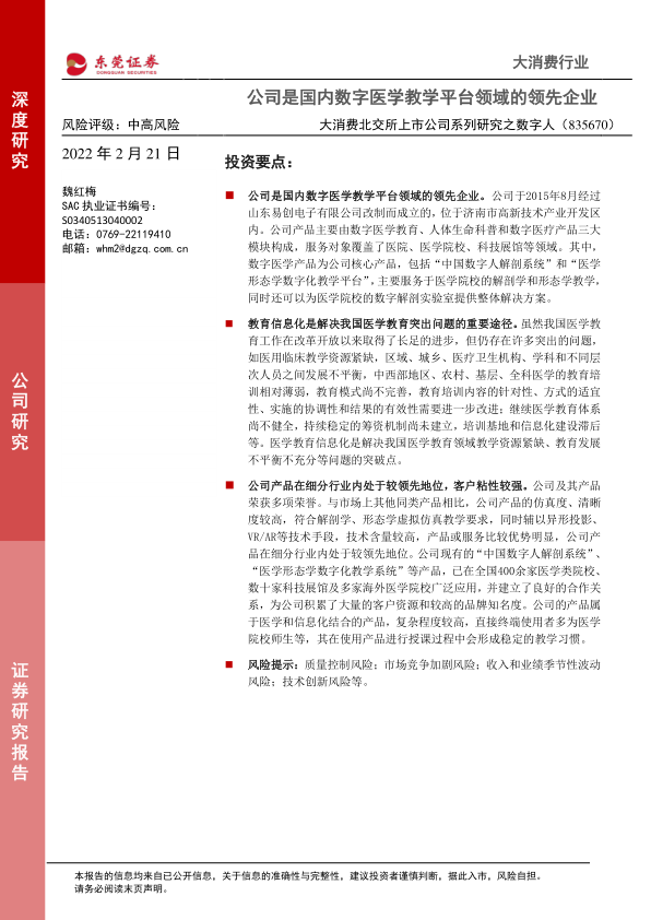 本报告分析了数字人(835670)这家国内数字医学教学平台领域的领先企业。报告指出,公司凭借其核心产品——“中国数字人解剖系统”和“医学形态学数字化教学平台”,在医学教育信息化领域占据重要地位。