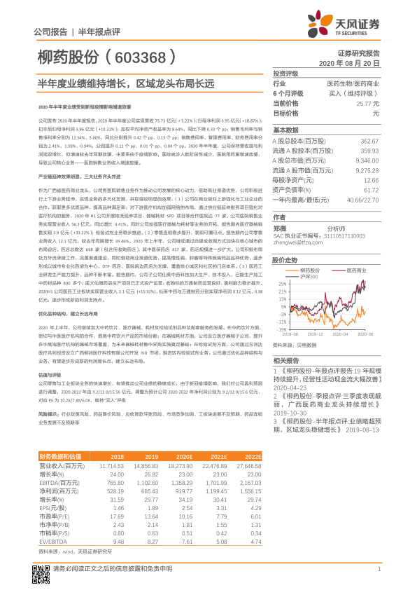 本报告对柳药股份2020年半年度业绩进行了分析,核心观点如下: