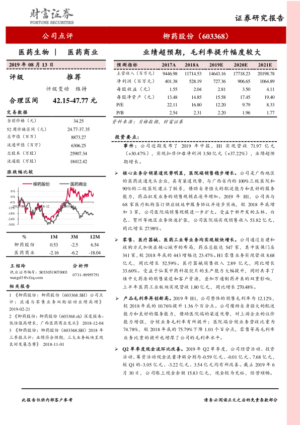报告指出,柳药股份的毛利率显著提升,主要得益于议价能力增强和高毛利率业务比重提升。基于此,报告对公司未来几年的营业收入和归母净利润进行了预测,并给出了相应的投资评级和合理区间。