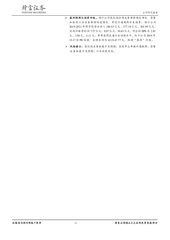 报告预计公司医院端分销业务保持稳定增长,零售和医药工业业务保持快速增长,并考虑万通制药并表因素。预计公司2019-2021年将实现营业收入146.43亿元、177.18亿元、201.99亿元,实现归母净利润7.27亿元、9.07亿元、10.65亿元,对应的EPS为2.81元、3.50元、4.11元。参考医药流通行业估值水平,给予公司2019年15-17倍PE估值,合理区间为42.15-47.77元,维持“推荐”评级。
