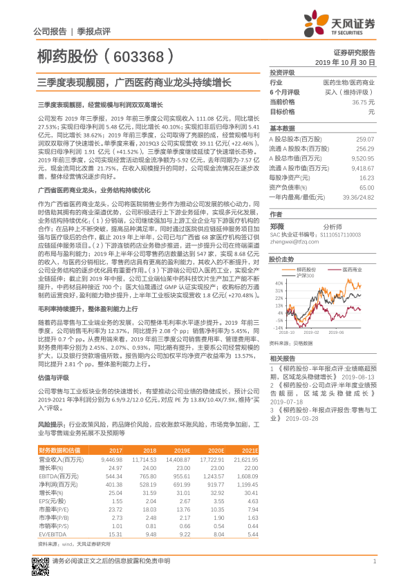 本报告对柳药股份的三季度业绩进行了全面分析,公司三季度业绩表现靓丽,经营规模和利润均实现快速增长。公司作为广西省医药商业龙头,通过优化业务结构、提升盈利能力,实现了稳健发展。报告维持对公司的“买入”评级,并提示了相关风险。