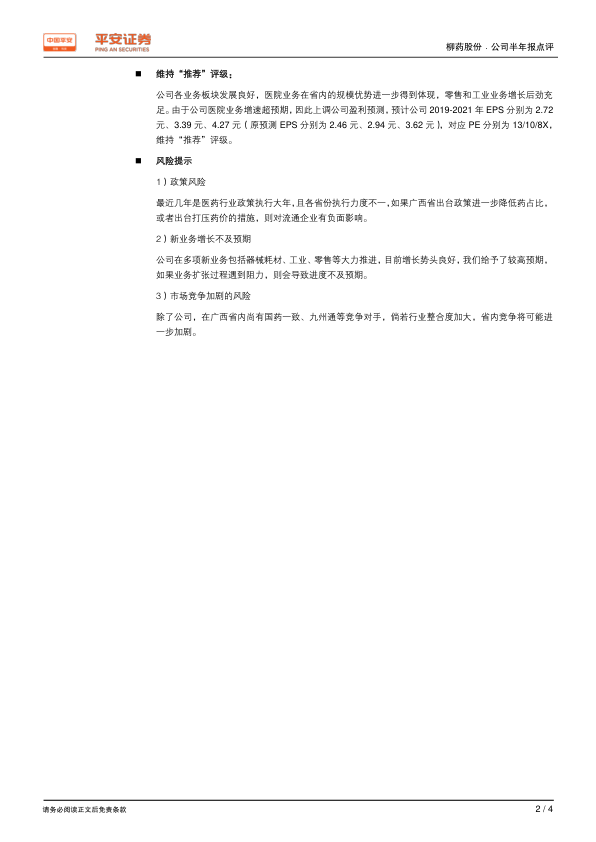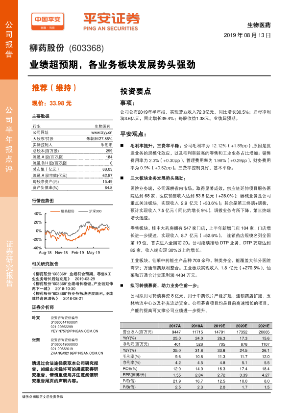 柳药股份2019年半年度业绩超出预期,主要得益于毛利率的提升和三大业务板块的强劲发展。公司医院业务在省内规模优势明显,零售和工业业务增长迅速。公司拟通过发行可转债募资8亿元,用于产能扩建和补充流动资金,这将进一步支持公司业务的扩张和业绩的提升。平安证券维持对柳药股份的“推荐”评级,并上调了公司未来三年的盈利预测。但同时也提示了政策风险、新业务增长不及预期以及市场竞争加剧的风险。