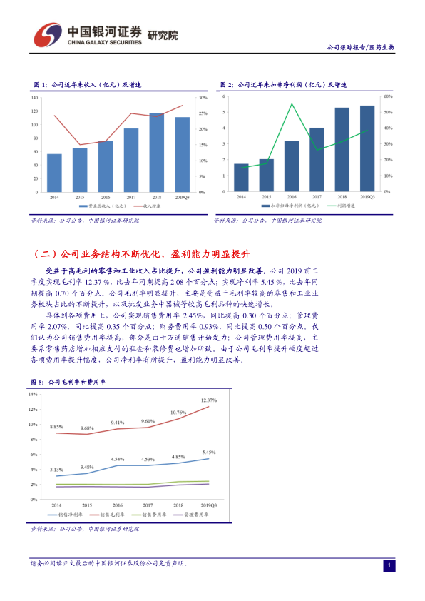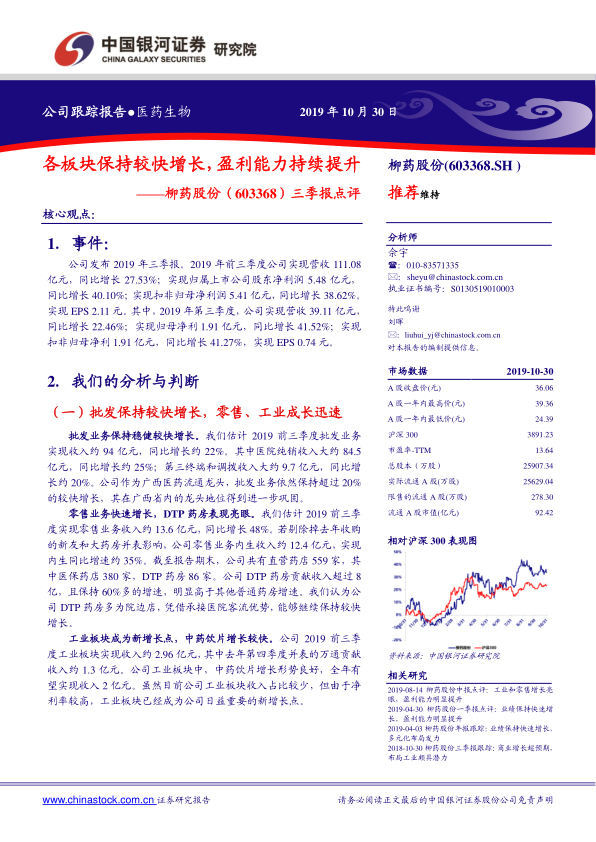 本报告对柳药股份2019年三季报进行了深入分析,指出公司在营收和盈利能力方面均表现出色,各业务板块保持较快增长。公司作为区域医药流通龙头,对政策具有较强的适应能力,且估值偏低,具备投资价值。维持“推荐”评级,但同时也提示了批发市场整合、连锁药店布局和工业产品放量等方面的风险。