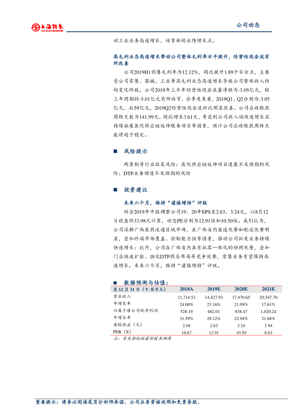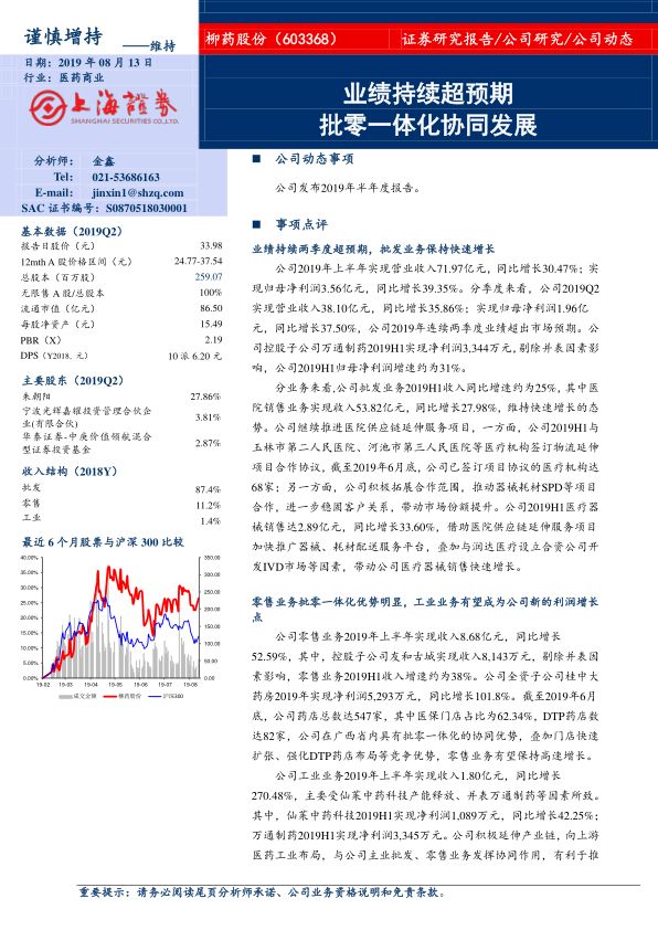 柳药股份2019年上半年业绩表现强劲,批发、零售和工业业务均实现显著增长。高毛利业务的快速发展带动了整体毛利率的提升。维持“谨慎增持”评级,公司在广西医药流通市场具有显著优势,但同时也面临行业政策、项目进展和业务增速等风险。