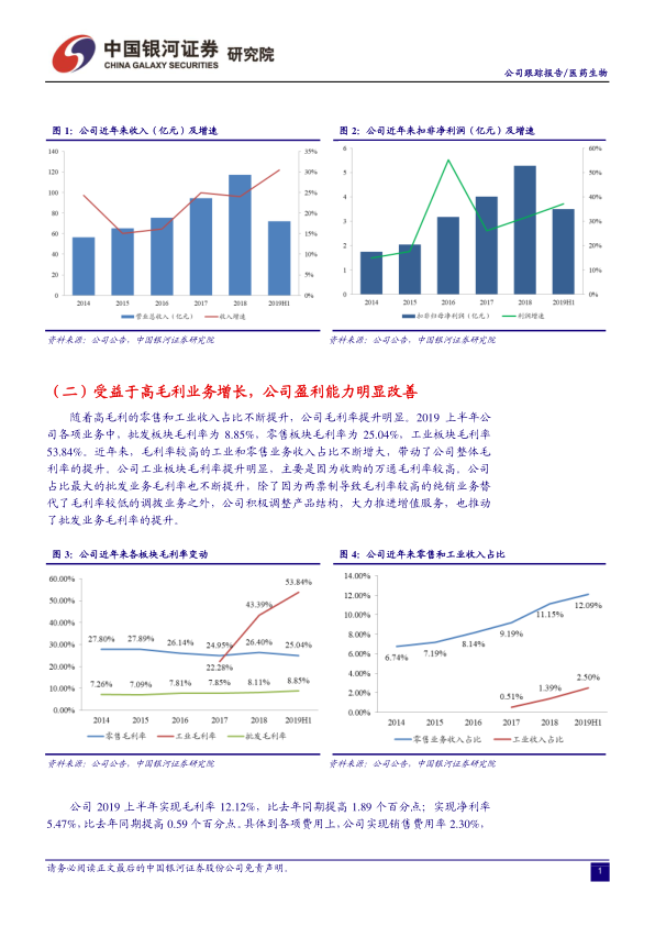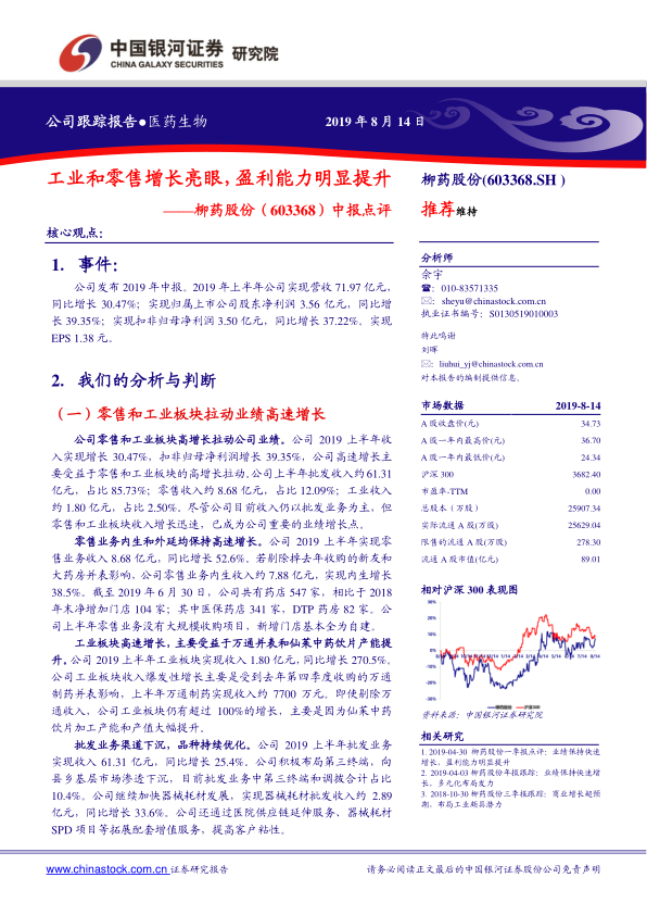 柳药股份2019年上半年业绩表现突出,营收和净利润均实现高速增长,主要得益于零售和工业两大高毛利业务板块的强劲拉动。公司通过内生增长和外延并购,持续优化业务结构,显著提升了整体盈利能力。作为广西区域的医药流通龙头,柳药股份在面对医改政策冲击时展现出强大的适应性和免疫力,并有望在GPO模式等新政策环境下进一步巩固市场地位。当前公司估值偏低,且医药流通行业政策环境持续改善,为公司未来的快速成长提供了有利条件。分析师看好公司零售和工业板块的高成长潜力、区域整合优势以及批发业务的产品结构调整,维持“推荐”评级。