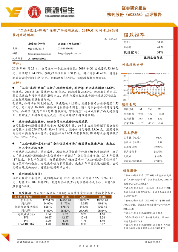 2019年4月22日,柳药股份发布一季度业绩快报,营收33.86亿元,同比增长24.89%;归母净利润1.60亿元,同比增长41.68%;扣非后归母净利润1.55亿元,同比增长36.56%,业绩增长超市场预期。
