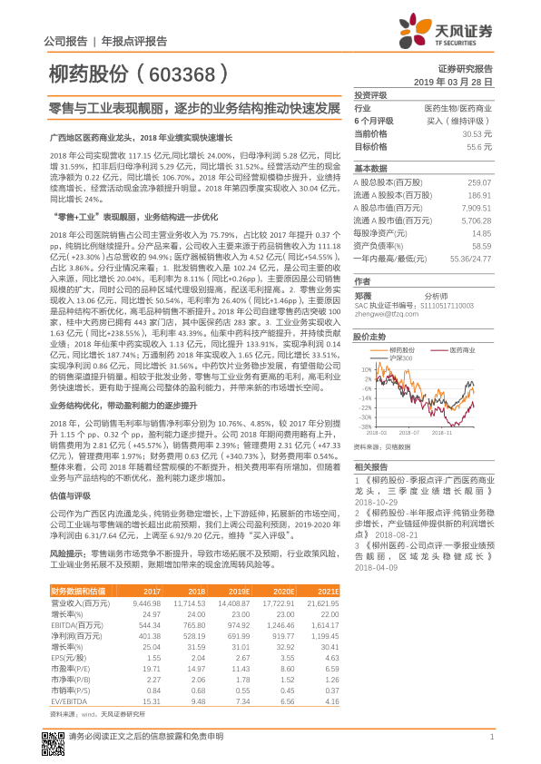 柳药股份在2018年取得了令人瞩目的业绩,营业收入和归母净利润分别实现24.00%和31.59%的高速增长,经营活动现金流净额也大幅提升106.70%。这一强劲表现主要得益于公司“零售+工业”双轮驱动的业务模式,特别是零售业务收入同比增长50.54%和工业业务收入同比增长238.55%,这些高毛利业务的快速发展显著优化了公司整体业务结构。尽管期间费用有所增加,但业务结构的优化成功带动了销售毛利率和销售净利率的同步提升,显示出公司盈利能力的持续增强。基于此,分析师上调了公司未来盈利预测,并维持“买入”评级,但同时提醒投资者关注零售市场竞争、行业政策及现金流等潜在风险。