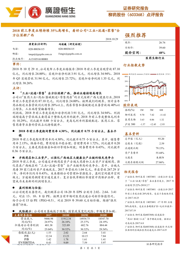 柳药股份在2018年前三季度实现了营收和归母净利润的持续高增长,分别达到24.00%和34.94%。这一强劲业绩主要得益于公司在广西地区“工业+流通+零售”全方位深耕战略的有效实施,以及高毛利率业务占比的提升,使得整体毛利率同比提升0.88个百分点。公司通过并购古城大药房和万通制药,进一步巩固了其全产业链竞争力,为未来增长奠定了坚实基础。尽管期间费用率略有上升,但整体保持平稳。分析师基于对公司未来盈利能力的乐观预测,维持“强烈推荐”评级,并设定了39.60元的目标价,凸显了其投资价值。