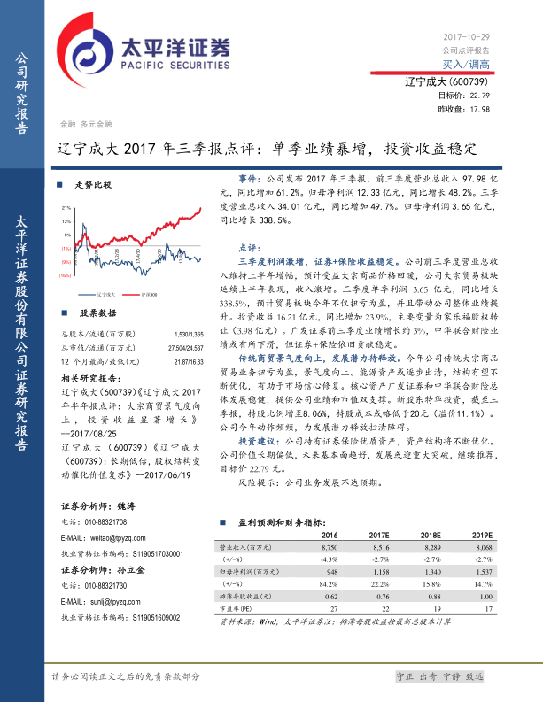 本报告对辽宁成大2017年三季报进行了详细分析,认为公司业绩增长主要受益于大宗商品贸易的回暖和投资收益的稳定贡献。公司传统商贸业务景气度提升,资产结构不断优化,叠加新股东的进入,发展潜力值得期待。维持“买入”评级,目标价22.79元。