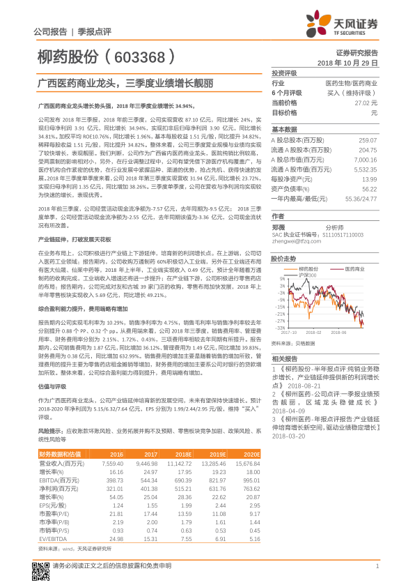 柳药股份在2018年前三季度展现出强劲的业绩增长,营收和归母净利润均实现显著提升,巩固了其在广西医药商业领域的龙头地位。公司通过积极向上游医药工业和下游零售药店进行产业链延伸,成功培育了新的利润增长点,为未来发展打开了新的空间。尽管费用端有所增加,但公司的综合盈利能力持续提升。基于其稳健的增长势头和战略布局,分析师维持了“买入”评级,并对未来盈利能力持乐观态度,但同时提示了相关风险。